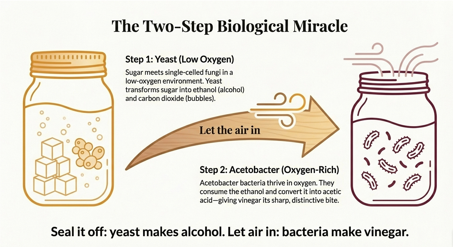 The short version: seal it off, yeast make alcohol. Let air in, bacteria make vinegar. Two steps, thousands of years of human history, one extremely useful condiment.